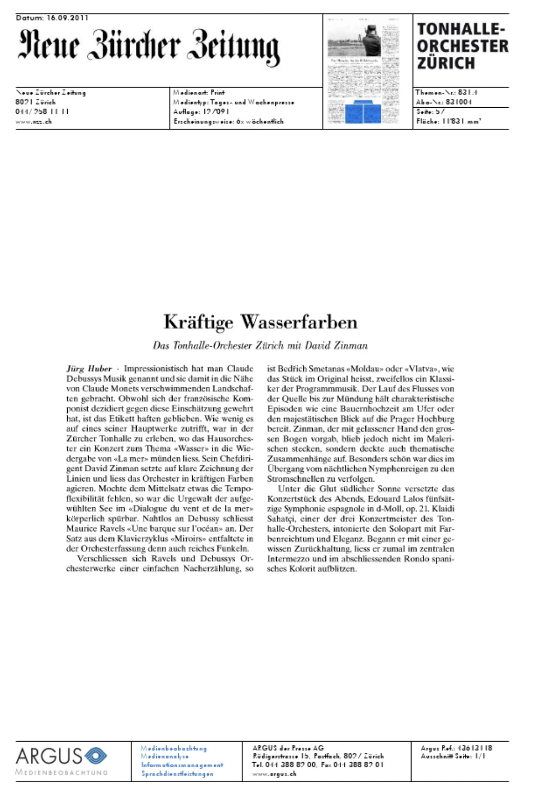 Claude Debussy's music has been called Impressionist, thereby bringing it close to Claude Monet's blurred landscapes. Although the French composer decidedly resisted this assessment, the label has stuck. How little it applies to one of his major works could be experienced at the Zurich Tonhalle, where the house orchestra let a concert on the theme of "Water" culminate in the performance of "La mer." Its chief conductor David Zinman focused on clear drawing of lines and let the orchestra act in vibrant colors. While the middle movement may have lacked some tempo flexibility, the primal force of the turbulent sea in the "Dialogue du vent et de la mer" was physically palpable. Maurice Ravel's "Une barque sur l'océan" connects seamlessly to Debussy. The movement from the piano cycle "Miroirs" unfolded rich sparkle in its orchestral version.